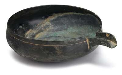 Comprising a large circular bowl; a smaller footed bowl and a pouring vessel of bowl form with a short spout; verdigris patination throughout.