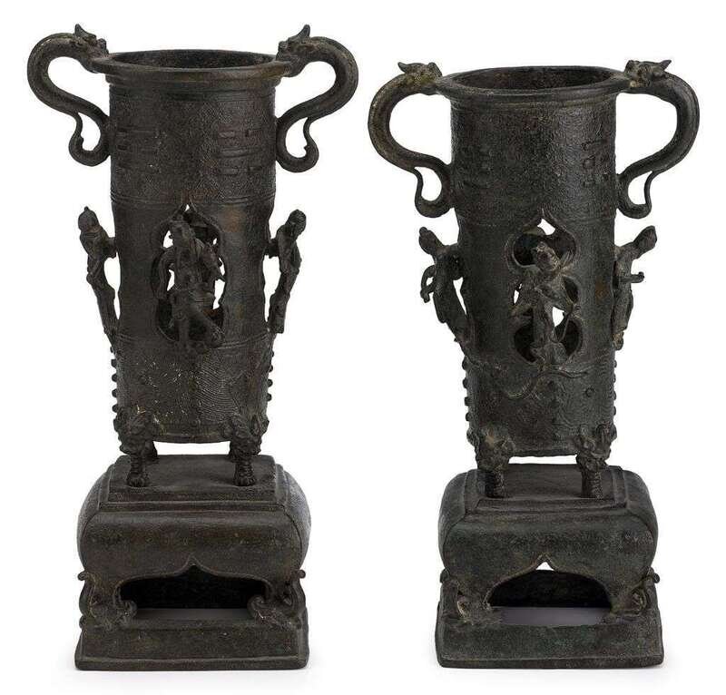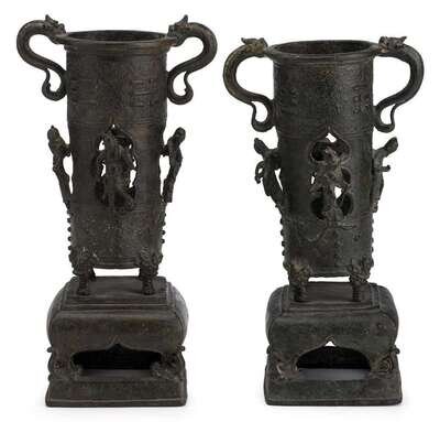 Pair of Chinese tri-gram and immortal cast bronze incense stands ming dynasty or later