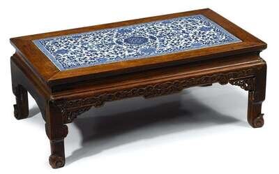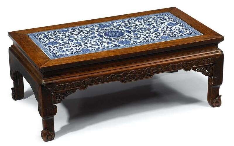 The top porcelain panel decorated with Indian lotus and buddhist emblems surrounding a central medallion, set within a waisted table with shaped apron and scroll feet.