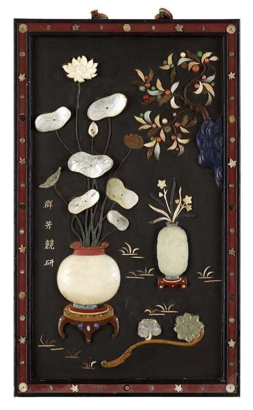 Chinese jade and applied lacquered wall panel 19th century, possibly earlier elements