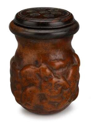 Round cricket cage moulded with fu dogs, with later wooden cover.