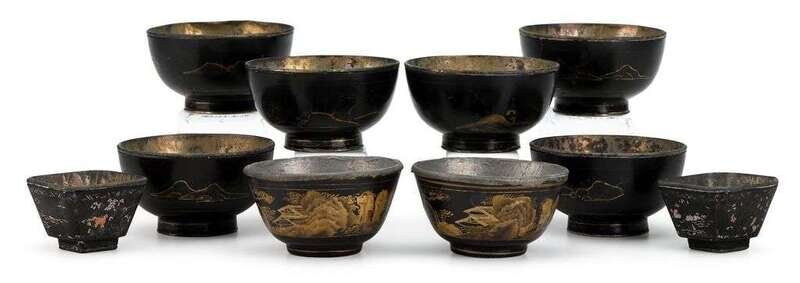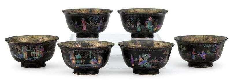 The six round bowls with slightly flared rims decorated to exterior with figures in garden scenes rendered in abalone and gold leaf; together with ten lesser lacquered bowls (16).