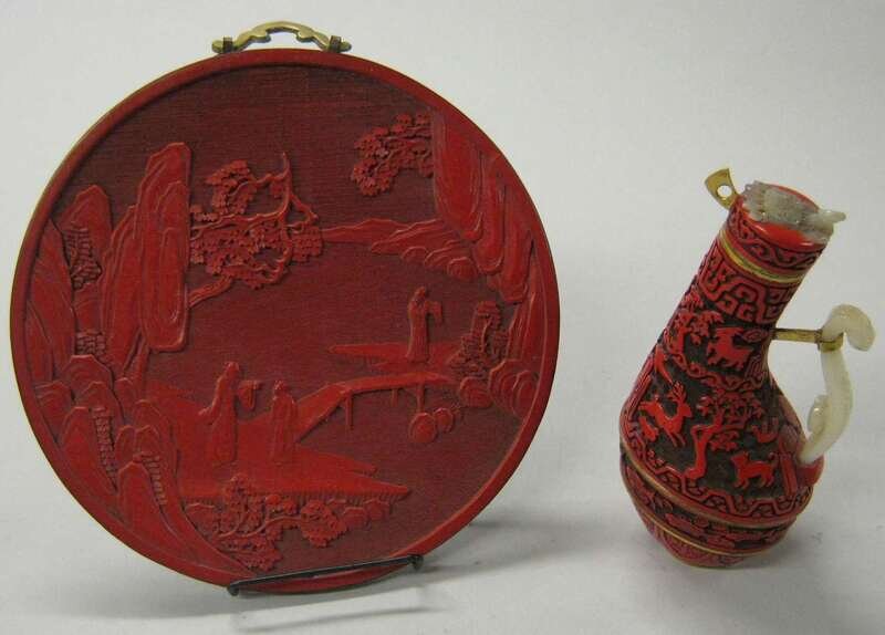 Chinese cinnabar lacquer wall plaque and ewer jade mounts 18th century