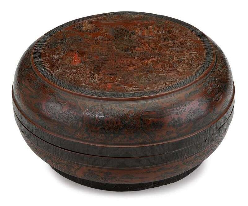 The cover is lacquered with the Eight Immortals in a mountainous river-landscape, the sides decorated with landscape cartouches against scrolling Indian lotus ground and leiwen band at rim; the black lacquer interior and base gilt embellished with stylized leaf motifs.