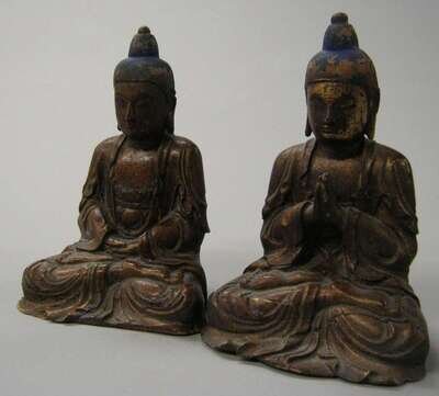 One seated in dyanasana with hands in dhyanamudra, robes falling in graceful folds revealing bare chest; the other seated in dyanasana with hands folded in front of chest and face cast in a serene expression; dyed blue at hair.