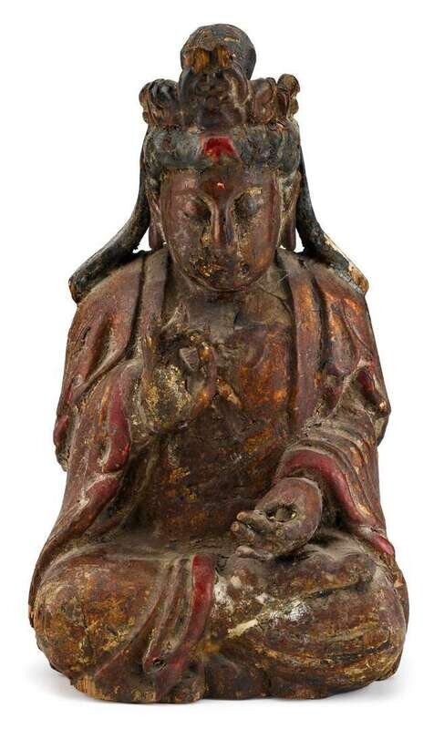 The carved polychrome figure seated in chin mudra wearing a long flowing robe and crown.