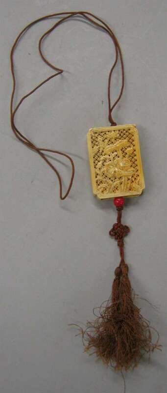 Rectangular with bracket corners, carved to front panel with a deer and crane, to reverse with lotus and birds, against a reticulated lattice ground.