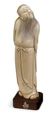 The well-carved standing figure with a long pen-work beard depicted in the typical garb and contemplative posture of a scholar; mounted to ivory-inlaid wooden base.