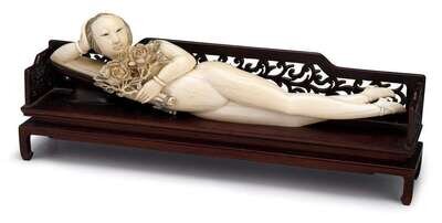 The female figure recumbent upon a long kang bench holding a bouquet of roses to chest.