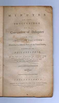 (Abolition Societies in the United States.) Minutes of the Proceedings of the Convention of Delegates from the Abolition Societies Established in different pasts of the United States, Assembled at Philadelphia,.. Philadelphia: Zachariah Goulson, Jr, 1794. 8vo, orig. wrappers; often scuffed, some creasing & minor chipping at edges. Minor internal corners creasing, scattered light foxing. Complete. Minutes of the first convention.