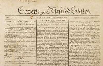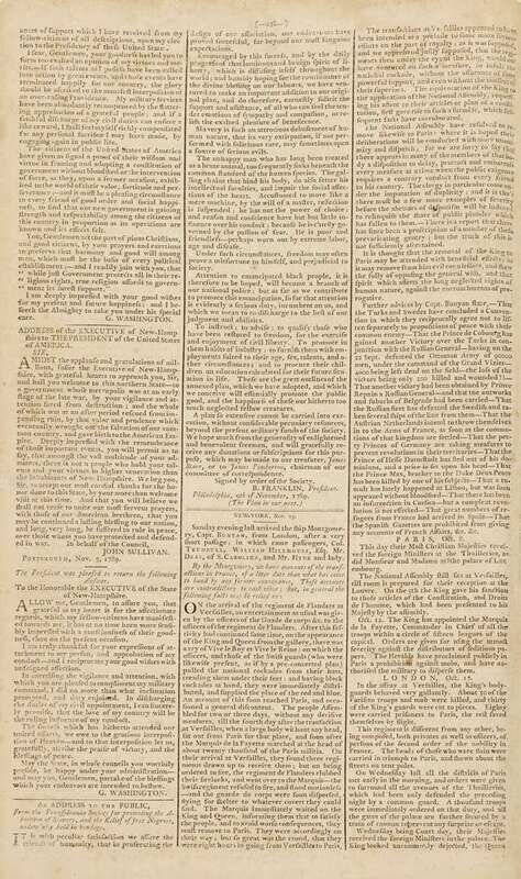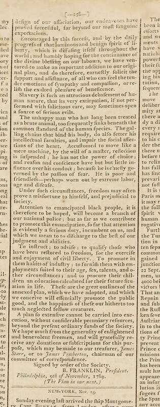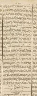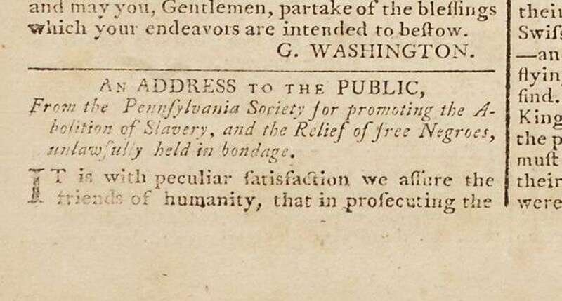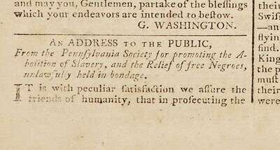 This issue of the paper most closely associated with the Federalist party & the administration of George Washington, contains an address to the public by Benjamin Franklin as President of Pennsylvania Society for promoting the abolition of slavery and the relief of free negroes. This is one of Franklin's strongest moral statements on a subject of great historical importance. Franklin did not speak out against slavery until very late in his life. It was only in 1789 that he wrote & published supporting the abolition of slavery; in 1790s his last public act was to send to Congress a petition on behalf of the Society asking for the abolition of slavery. This issue also published letters by George Washington.