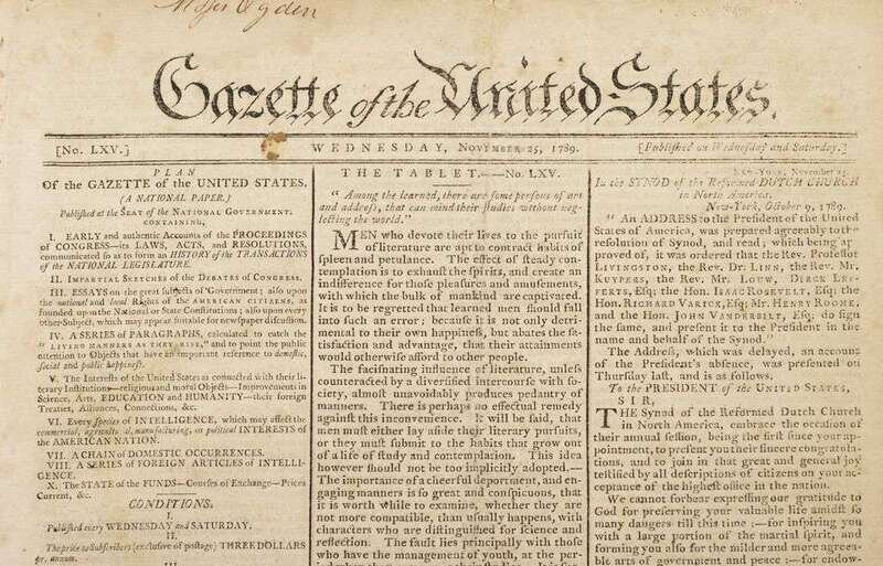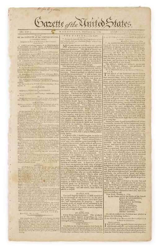 [Early American Newspapers - Benjamin Franklin on the Abolition of Slavery] Gazette of the United States. (New York), Wednesday, November 25, 1789. Folio, 16 1/2 x 10 inches; 412 x 254 mm. Attractively toned, small sewing holes.