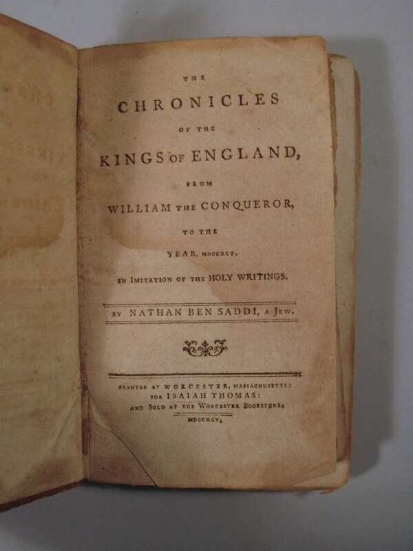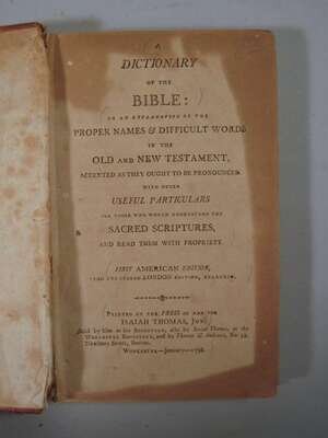 Isaiah Thomas, printer: (Dodsley, Robert.) The Chronicles of the Kings of England. Worcester, 1795. 12mo, contemp. sheep; rubbed. Crudely repaired. Some internal dampstaining, pp109-120 repaired - some loss of text, several gutters repaired. Evans 28579. * A Dictionary of the Bible. Worcester, 1798. 12mo, contemp. sheep; rubbed, worn, spine defective, covers detached. Lacking free endpapers. Edges of front & back matter browned. Complete with 5pp adverts at back. Evans 33638.