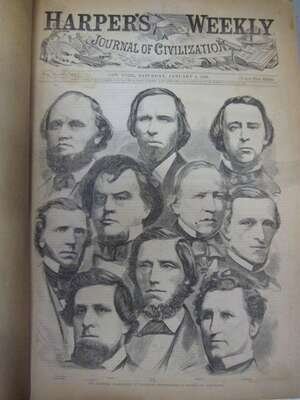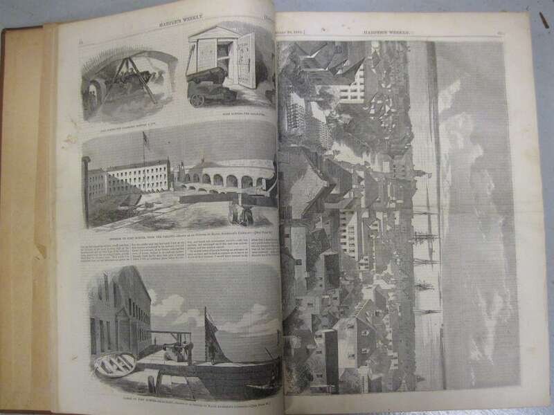 [Civil War.] Harpers Weekly, a Journal of Civilization. New York, Jan., 1861- Dec., 1865. Vols V-IX. Folio, 20th cent. brown buchram. Double, full-page & text wood engraved illustrations. A few heads trimmed close. Horizontal creasing at center of many sheets in 1861-1863 vols, several close tears, scattered cellotape repairs, a few repairs made with masking tape. Complete with all wood engraved illus. (Winslow Homer, T. Nast, et al.) a few Homer images repaired.