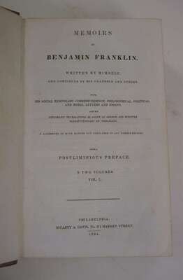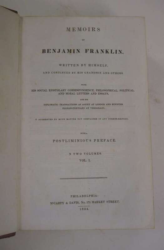 Franklin, Benjamin. Memoirs. Philadelphia: McCarty & Davis, 1834. 8vo, full contemp. speckled calf, black leather spine labels; corners lightly bumped, wear to extremities. Fold plates. Some scattered spotting. Former owner's bookplates to front paste-downs.