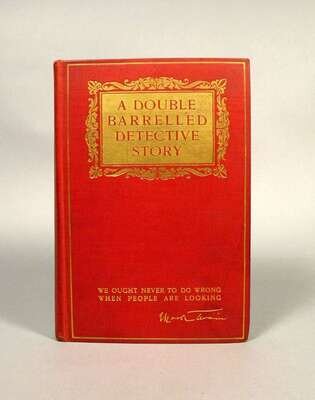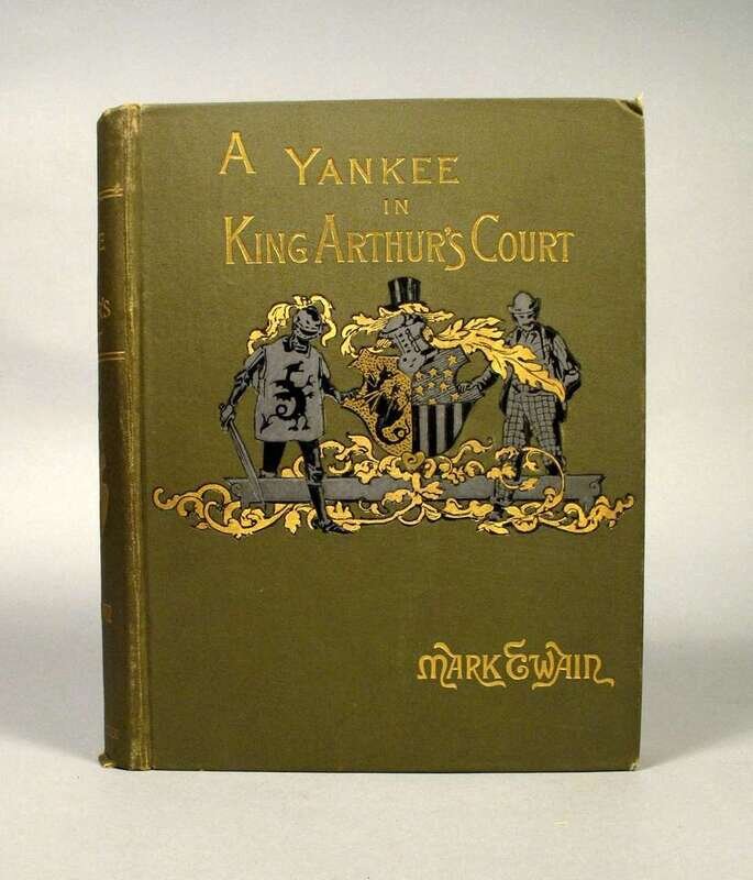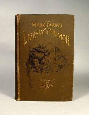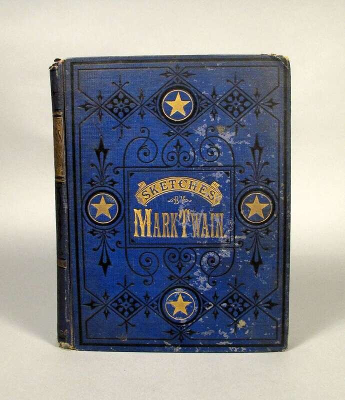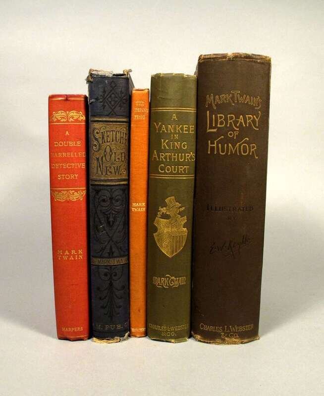 Clemens, Samuel L. [Mark Twain]: A Double Barrelled Detective Story. N.Y. & London: Harper & Brothers, 1902. 8vo, orig. gilt red cloth; corners bumped. Plates. Internally generally clean. BAL 3471* Sketches. Hartford, Conn.: The American Pub. Co., 1875. 1st ed., 2nd state. 4to, orig. gilt lettered blue cloth; stained, corners bumped, wear to head and foot of spine. Hinges a bit loose. Former owner's notations on front free endpaper. Binding loose. Light toning and scattered spotting. BAL 3364. * The Jumping Frog. N.Y. & London: Harper & Brothers Pub., 1903. 1st thus. 8vo, orig. pictorial red cloth; corners bumped, spine faded. BAL 3477. * A Connecticut Yankee in King Arthur's Court. N.Y: Charles L. Webster, 1889. 1st Amer. ed. Lg. 8vo, orig. gilt-lettered, gilt blue & black stamped olive green cloth; corners bumped, light wear to edges & joints. Frontis, other illus. Gutter of frontis & title starting to separate. Small areas of discoloration from newspaper on pp XIV & XV. Without fly title & fly adverts at back. Bookplate of Walter Chrysler on paste-down. Bright front cover. BAL 3429. * Library of Humor. N.Y: Charles L. Webster, 1888. 1st ed., 2nd state. 4to, orig. gilt-lettered olive green cloth; corners bumped, edges worn. Hinges loose. Light discoloration. BAL 3425.