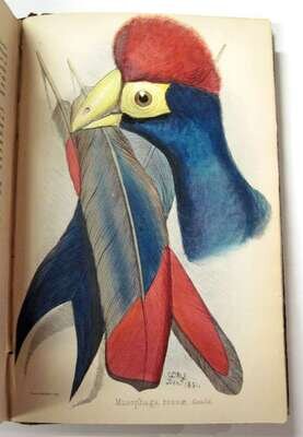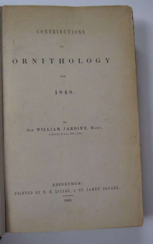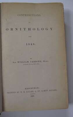 Jardine, William. Contributions to Ornithology for 1848. Edinburgh: W.H. Lizars, 1848-1850. 8vo, contemp. 1/2 morocco & marbled bds; edge wear, joints tender. With 56 (44 hand colored) plates, other illus. Light toning. Plates generally clean and bright.