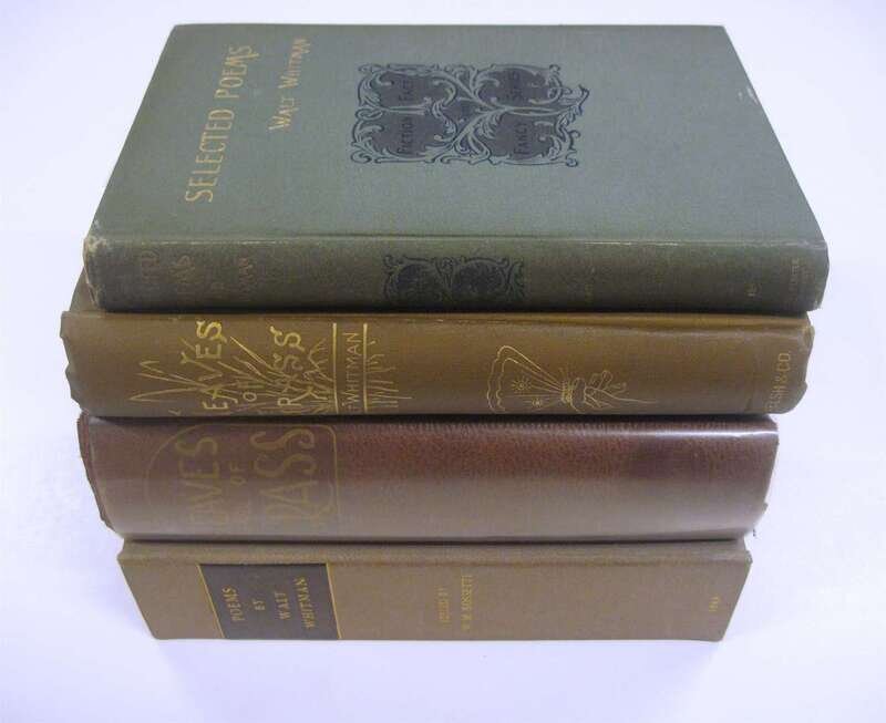 Whitman, Walt: Poems. L: John Camden Hotten, 1868. 1st English ed. 8vo, orig. blue cloth, blind stamped covers, gilt-lettered spine, rough trimmed; light wear. Port., 8pp pub. cat at front, 8pp & 16pp pub. cat. at rear. Light to moderate foxing to port., title-page, adverts & front matter, other scattered light foxing. Edited by William Michael Rossetti. Sound copy in custom cloth fall down box. BAL 21401 - bdg state B. * Leaves of Grass. Boston: Thayer and Eldridge, 1860-61. 3rd [unorthorized] ed., 3rd ptg. 12mo, orig. purple cloth, bevelled bds, blind covers, gilt & blind spine; light edge wear. Frontis. Front hinge cracked. Complete. Internally crisp & clean. BAL 21397 - port. & bdg states C. * Leaves of Grass. Phila: Rees Welsh, 1882. 12mo, orig. brown cloth, gilt; light wear. Port. Tight bright copy. With specimen days slip tipped in. BAL 21419. * Selected Poems. N.Y: Charles S. Webster, 1892. 12mo, orig. gilt-lettered green cloth; light to moderate edge wear. Frontis port. Dampstaining to heads of text leaves, presentation copy from the pub. to Horace Howard Furness. BAL 21638, 1st issue.