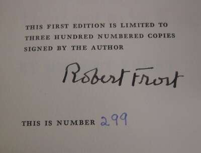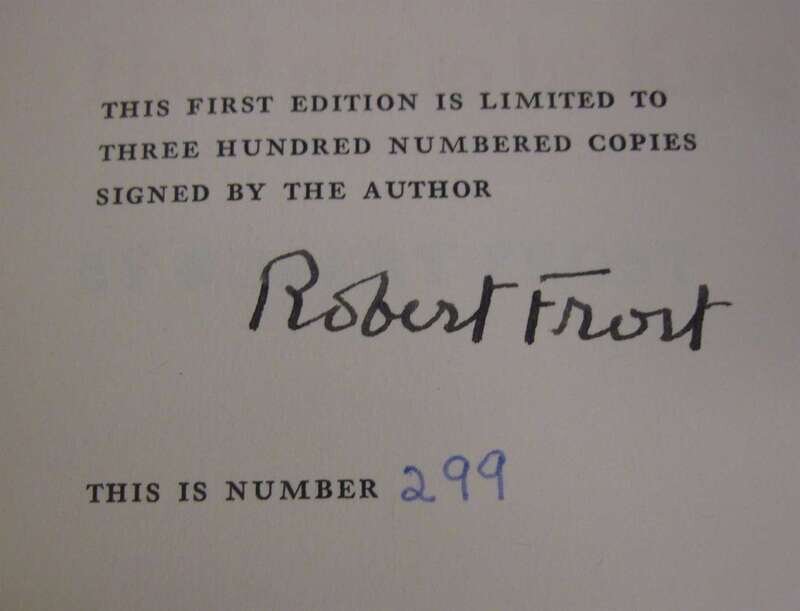 Frost, Robert. [Signed Copies]: West Running Brook. N.Y: Henry, Holt, (1928). 1st trade ed. Tall 8vo, orig. green cloth & bds, paper cover label, top edge stained yellow, other edges untrimmed, d/j. Attractive copy. Signed, dated "Hartford / October 1937" & signed by Robert Frost on front free endpaper recto. Crane A10. * Hard Not to be King. N.Y: House of Books, 1951. 1st ed., #299/300 signed by Robert Frost. 12mo, orig. blue cloth, gilt, glassine. Bright copy. Crane A36.