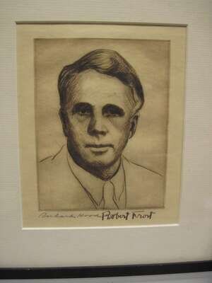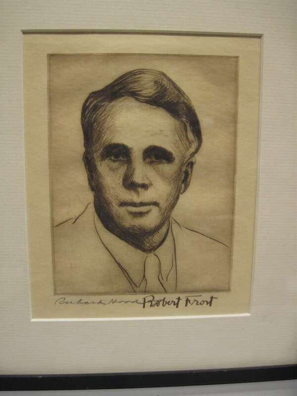 Engraved Portrait. Hood, Richard. "Robert Frost." Signed by Robert Frost in ink, lower right, also pencil signed by Richard Hood. 5 1/2 x 4 1/8 inches; 139 x 101 mm - plate mark. Light discoloration. Framed.