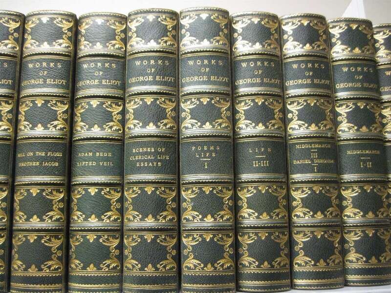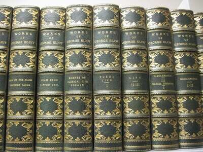 Eliot, George. Works. New York: Bigelow, Brown. N.d. [c1910.] Contemp. blue morocco & silk, gilt, t.e.g., richly gilt spine compartments; scuffed & spine ends very slightly scuffed, spines fading to green. Frontispieces.