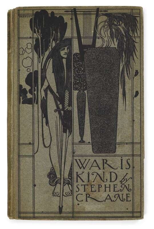 Crane, Stephen. War is Kind. N.Y: F.A. Stoker, 1899. 1st ed. Illus. & designed by Will Bradley. 8vo, orig. pictorial grey bds, paper spine label, untrimmed edges; spine edns very slightly rubbed, other minor edge wear, head of front joint starting to crack, d/j (head of spine panel chipped, other light edge wear.)