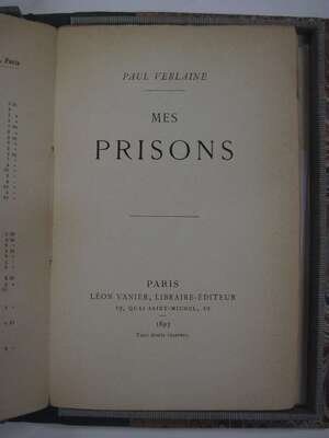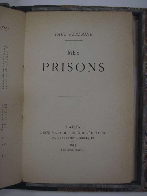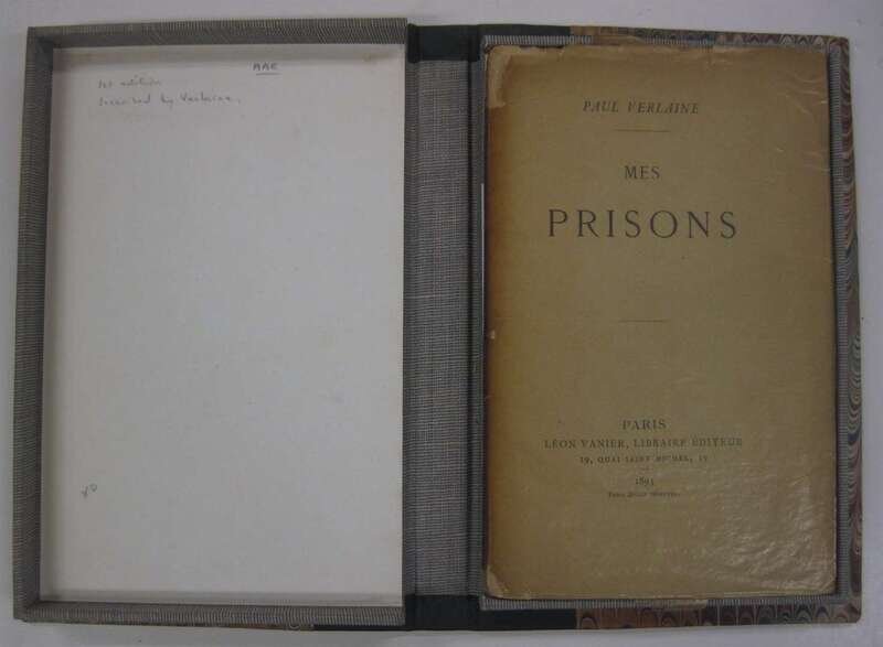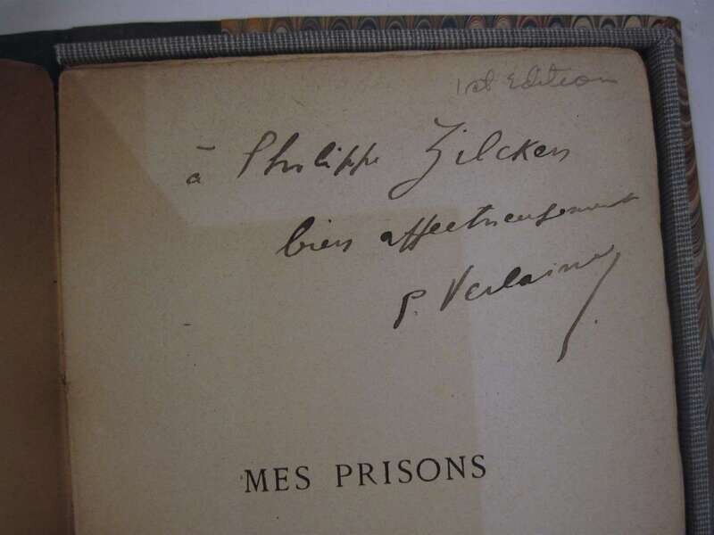 Verlaine, Paul. Mes Prison. Paris: Leon Vanier, 1893. 1st ed. 8vo, orig. printed cream colored paper wrappers, orig. glassine (chipped.) Presentation copy, inscribed to Phillip Zilchen & signed on 1/2 title by P(aul) Verlaine. Minor discoloration to 1/2 title. Untrimmed, in custom morocco & bds fall-down box.