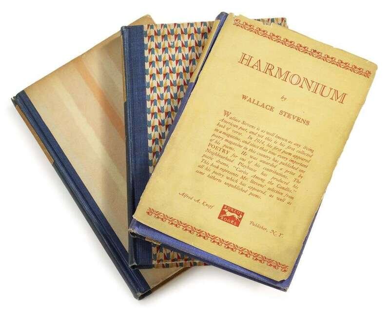 Stevens, Wallace: Harmonium. N.Y: Knopf, 1923. 1st ed., 1st bdg state. 8vo, orig. blue cloth backed color-patterned bds, paper spine label, top edge stained red, other edges untrimmed; corners very lightly rubbed, spine ends very slightly scuffed, other minor edge wear, perhaps very slightly darkened. Elelstein A1a1. * The 2nd bdg state of the 1st ed. of the preceding, 8vo, orig. color striped bds, paper spine label, top edge stained orange, other edges untrimmed, corners just rubbed, other very light edge wear, endpapers slightly toned, small old paper clip residue at head of front free endpaper. Partly unopened. E A1a2. * The 3rd bdg state of the 1st ed. of the preceding, 8vo, orig. blue cloth, paper spine label; light edge wear, d/j (bottom 3/4 of spine panel gone, front flap detached, other occasional chipping to edges, slightly dusty. E A1a3.