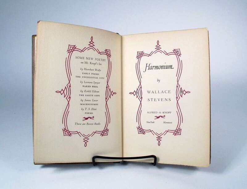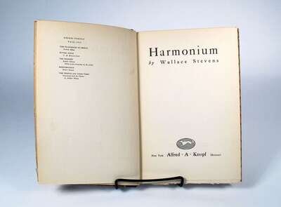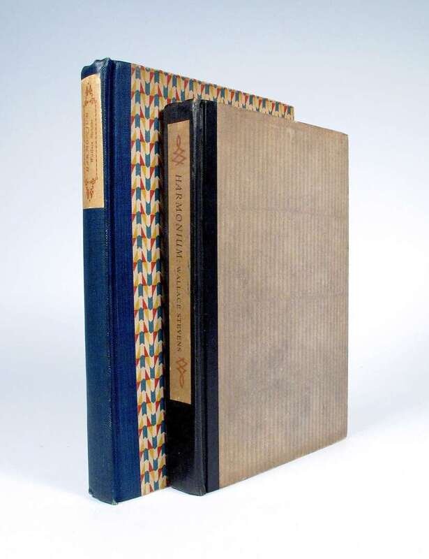 Stevens, Wallace. Harmonium. N.Y: Knopf, 1923. 1st ed., 1st bdg state. 8vo, orig. color-patterned bds, top edge stained red, other edges untrimmed, paper spine label; corners & adjacent bd edges rubbed, very slightly darkened. Sm. glue residue on 1/2 title & facing endpapers. Elelstein A1a1. * The 2nd ed. of the preceding, N.Y: Knopf, 1931, 1st bdg state, 12mo, orig. black cloth-backed grey bds, top edge stained reddish-brown, other edges untrimmed, paper spine label; light wear. E. A1b1.