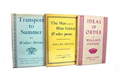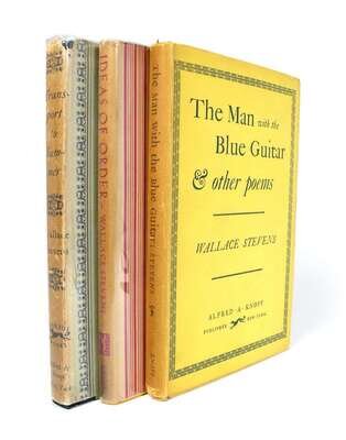 Stevens, Wallace: Ideas of Order. N.Y: Knopf, 1936. 1st trade ed., 1st bdg state. 12mo, orig. color striped cloth, top edge stained blue, other edges untrimmed, paper spine label; minor wear, d/j (price-clipped, occasionally very slightly dusty.) Attractive copy. Edelstein A2b1. * The Man with the Blue Guitar. N.Y: Knopf, 1937. 1st ed., 2nd state of d/j. 12mo, orig. yellow cloth; light edge wear, occasionally slightly dusty, d/j (price clipped, spine panel & flap joints darkened.) Some dark staining to front endpapers & 1/2 title gutters. * Transports to Summer. N.Y: Knopf, 1947. 1st ed., 1st ptg. 12mo, orig. black cloth backed green bds, paper spine label; light edge wear, d/j (minor chipping to edges, spine panel darkened.) Some darkening to front endpapers & front matter. E A11a.