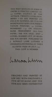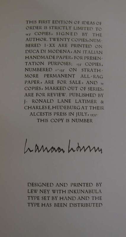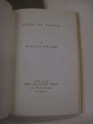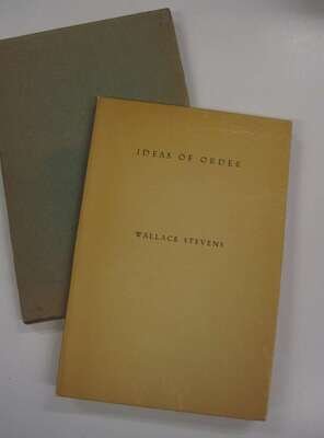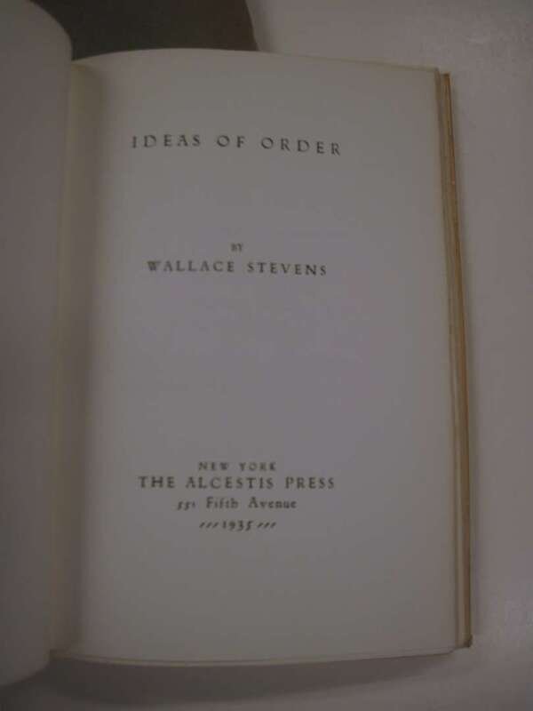 Stevens, Wallace. Ideas of Order. N.Y: Alcestis Press, 1935. 1st ed., 1/135 (of 165), out of series copy. 8vo, orig. lettered heavy ivory wrappers over flexible bds, glassine, slipcase, fore & bottom edges untrimmed. NF+ in repaired slipcase.