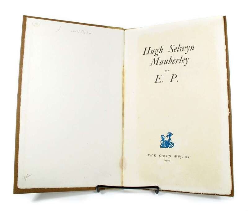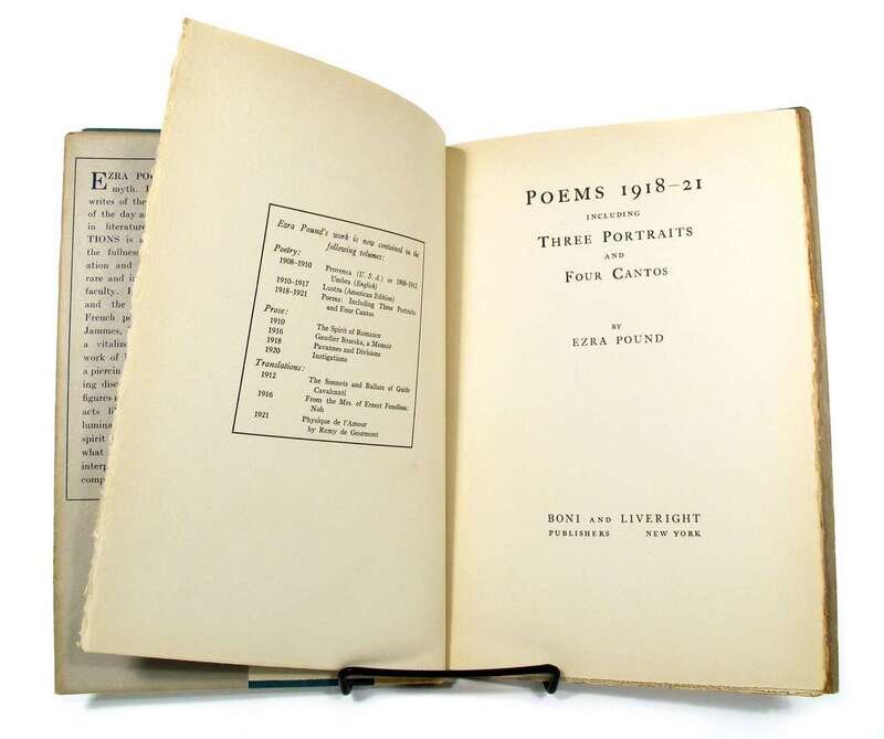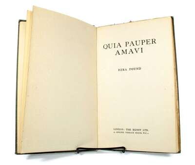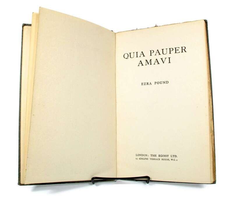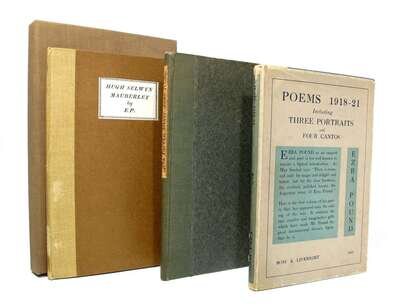 Ezra Pound: Quia Pauper Amavi. London: Egoist, [1919]. 1st trade ed. Tall 8vo, orig. green cloth & bds, paper spine label; extremities of bds, spine ends & label scuffed. Untrimmed. Minor internal spotting. Gallup A17a. * Hugh Selwyn Mauberley by E.P. N.P.: Ovid Press, 1920. 1st ed. #188/200. Tall 8vo, orig. brown cloth & bds; light wear. Title-page & verso of last leaf starting to discolor. Unopened, in custom cloth fall-down case. Gallup A19a. * Poems 1918-21. N.Y: Boni and Liveright, (1921). 1st ed. Tall 8vo, orig. paper vellum & bds, untrimmed edges; minor edge wear, spine starting to discolor, d/j (slightly scuffed, a few small chips at edges.) Gallup A21a - calling for d/j priced $2.50 - the above price $3.00.