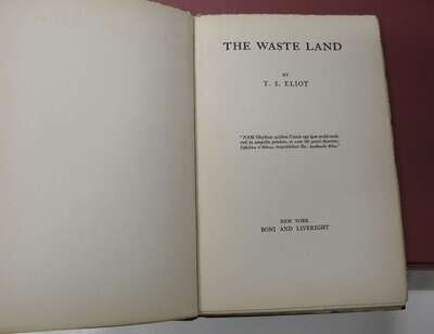 Eliot, T.S: The Waste Land. N.Y: Boni and Liveright, (1922). "Second Edition" [but 1st ed., 2nd impression] #762/1000. 12mo, orig. gilt-lettered black cloth, edges untrimmed; light wear. Gallup A6b. * The Waste Land: A Facsimile...of the Original Drafts.. [London]: Faber and Faber, (1971). #469/500. 4to, orig. red cloth, gilt, slipcase with paper label. Minor crease on title page. * Ezra Pound: His Metric and Poetry. New York: A.A. Knopf, 1917 (pub. 1918). 1/1000 copies. 1st ed. 12mo, orig. gilt-lettered rose cloth; some edge wear, spine starting to chip & just starting to separate, spine ends just starting to chip, glassine (some chipping). Frontis port. Internally clean, sound copy.
