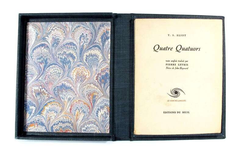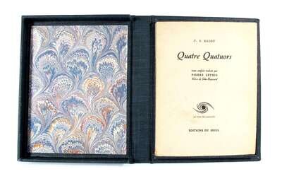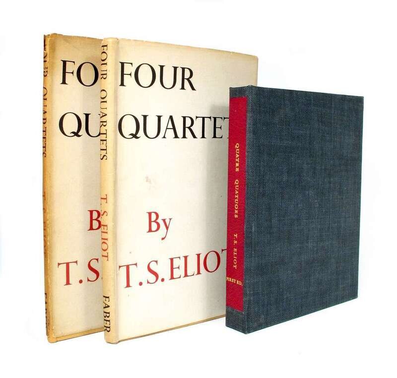 Eliot, T.S. Four Quartets. L: Faber & Faber, (1944). 1st English ed. 8vo, orig. tan cloth, untrimmed & rough cut edges; light wear, d/j; some edge wear, occasionally dusty. Minor internal wrikling. Gallup A43b. * Another copy of the preceding, orig. tan cloth; light wear, d/j ( some edge wear, slightly dusty.) Minor internal wrinkling. * The 1st French ed., Quatre Quatuors, Paris, (1950), sm 4to, orig. wrappers, minor edge wear, parallel text, trade issue, custom fall down cloth box.