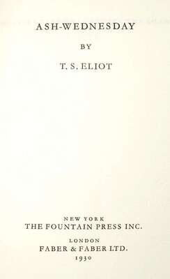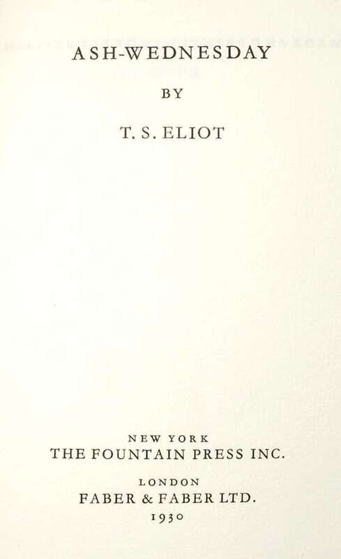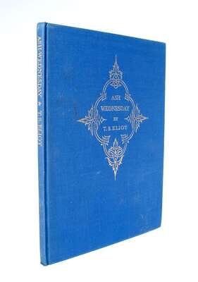 Eliot, T.S. Ash Wednesday. N.Y: Fountainhead; London: Faber & Faber, (1930). 1st ed., #348/600 signed by T.S. Eliot. Sm. 4to, orig. blue cloth, gilt; light wear, slipcase (worn, lacking top panel.) Endpapers slightly toned. Book plate on front paste-down.