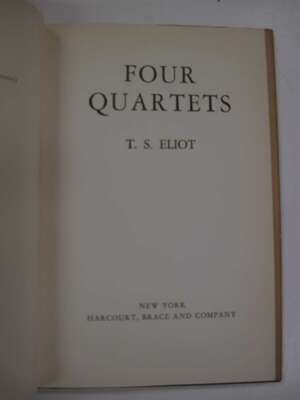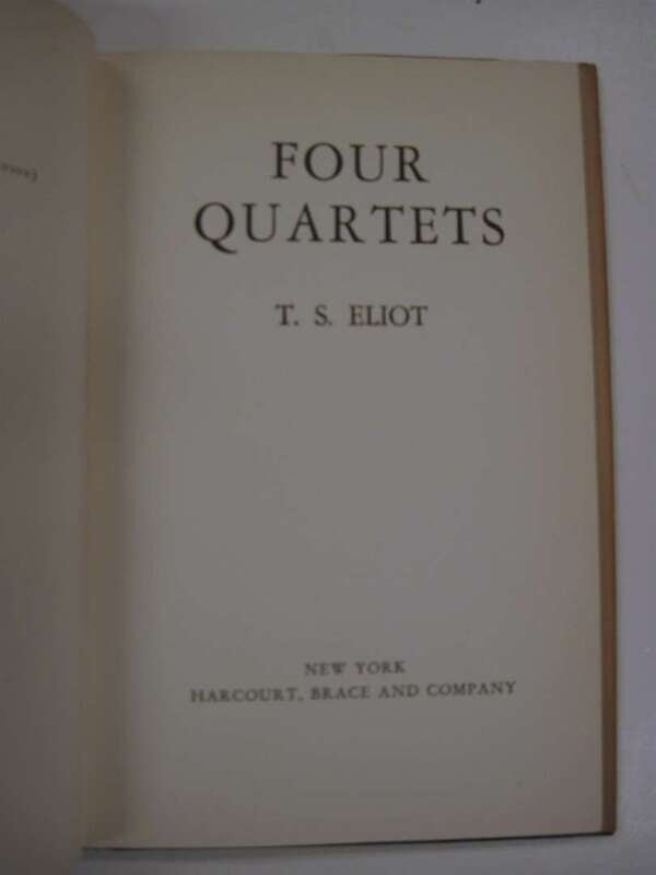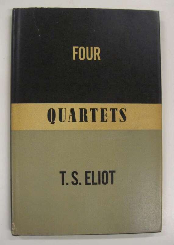 Eliot, T.S. Four Quartets. N.Y: Harcourt, Brace, 1943. 1st ed., 1st impression. 1 of 788 copies (3377 copies destroyed.) 8vo, orig. black cloth, gilt-lettered spien; minor wear, d/j; very slightly dusty, small chip at head & back panel, 1 1/2 inch fissgure from top edge of front panel, spine ends very slightly chipped. Attractive copy. With "first American edition" on verso of title page.