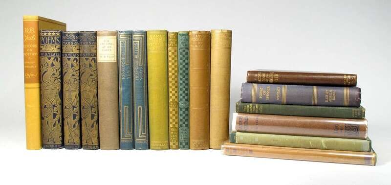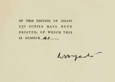 Yeats, W(illiam), B(utler). Essays. N.Y: Macmillan, 1924. #41/250 signed by W.B. Yeats. 8vo, orig. cloth-backed bds, paper labels; light edge wear, occasionally scuffed, minor scattered spotting & minor intermittent small dampstain. Light foxing to endpapers.