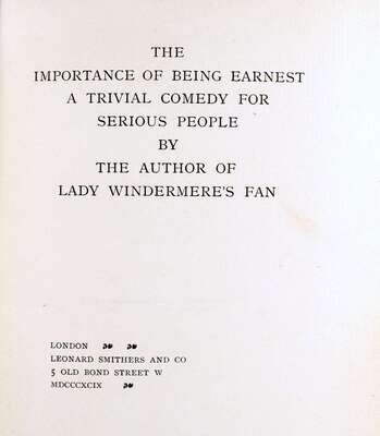 (Wilde, Oscar.) The Importance of Being Earnest. London: Leonard Smithers, 1899. 1st ed. 1/1000, out of series copy. 8vo, orig. gilt-decorated purple-brown cloth, rough cut edges; covers lightly to moderately scuffed, spine ends slightly frayed, endpapers starting to darken. Sound copy.