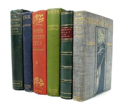 Conrad, Joseph: Almayer's Folly. London: T. Fisher Unwin, 1895. 1st ed., 1st issue. 8vo, early 20th-century full green calf, gilt; slightly scuffed. Trimmed, light foxing to front matter. Wise 1.* The Children of the Sea. N.Y: Dodd, Mead, 1897. 1st pub. ed. 8vo, orig. gilt-lettered pictorial blue-grey cloth, rough trimmed ed; slightly scuffed, light edge wear. Pub. in England, 1898, as "The Nigger of "Narcissus"." Generally attractive copy. W4.* An Outcast of the Islands. L: T. Fisher Unwin, 1896. 1st ed. 8vo, orig. green cloth, gilt-lettered spine, t.e.g., other edges rough trimmed; light edge wear. Attractive copy. W2.* Youth. N.Y: McLure, Phillips, 1903. 1st Amer. ed. 8vo, orig. gilt-lettered green cloth, t.e.g., other edges rough trimmed, light edge wear, very slightly cocked. W10.* Under Western Eyes. L: Methuen, (1911). 1st ed. 8vo, orig. red cloth, gilt-lettered spine; rough cut edges; light wear, some darkening to endpapers, minor fixing to front matter. Armorial book plate. W19.* Falk. N.Y: McClure, Phillips, 1903. 1st separate ed. 8vo, orig. gilt-lettered blue cloth, t.e.g., other edges rough cut; corners slightly bumped, spine ends & joints scuffed. Front hinge slightly stressed. Cuttler & Styles p24.