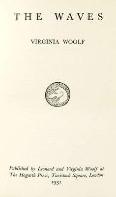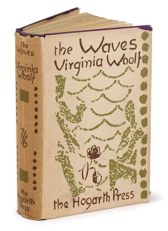 Woolf, Virginia. The Waves. London: Hogarth Press, 1931. 1st ed. 8vo, orig. purple cloth, gilt-lettered spine; light edge wear, bottom corners bumped, d/j (chipped at corners & spine ends - very minor loss to design elements, spine panel starting to darken, occasionally slightly dusty.) D/j designed by Vanessa Bell. A few small stains to top edge. Complete with 1/2 title, internally clean.