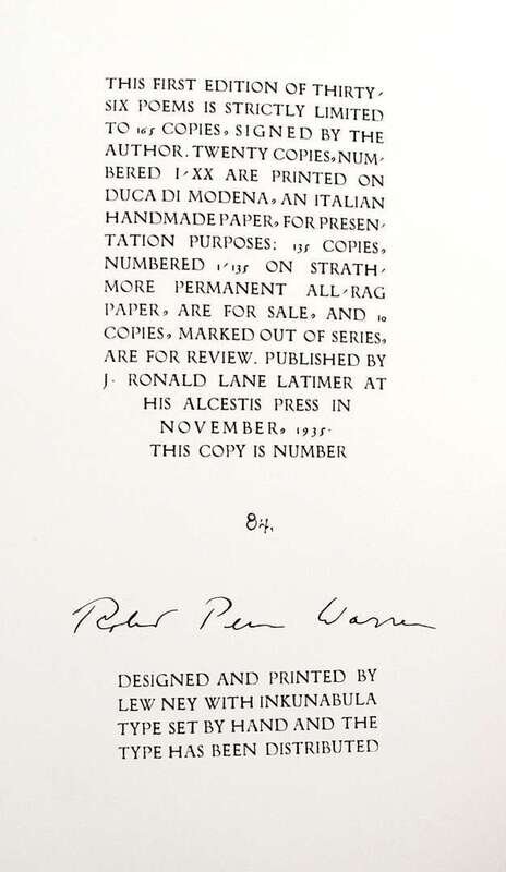 Warren, Robert Penn. Thirty-Six Poems. N.Y: Alcetis Press, 1935. 1st ed., #84/135 (of 165) copies. 4to, orig. stiff wrappers, d/j & glassine. Untrimmed. Bright & NF/F.