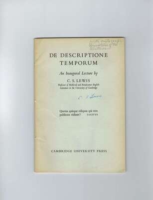 Lewis, C.S. De Descriptione Temporum. (Cambridge), (1955). Sm. 8vo, orig. printed wrappers; spine & edges slightly sunned. Signed on front wrappers by C.S. Lewis.