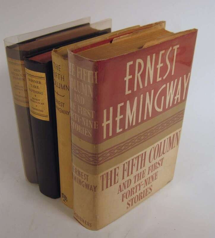 Hemingway, Ernest: Men Without Women. N.Y: C. Scribner's, 1927. 1st ed., 1st ptg. 12mo, orig. black cloth; gold covers of spine labels; very slightly cocked, other light wear. HA7a. * Winna Take Nothing. N.Y: Scribner's, 1933. 1st ed. 12mo, orig. black cloth, gold cover & spine labels; slightly cocked, other light wear. * The Fifth Column and the First Forty Nine Stories. N.Y: Scribner's, 1938. 1st ed. 8vo, orig. red cloth; light wear, occasionally slightly scuffed, d/j (some light creasing, occasionally slightly dusty.) Endpapers darkened. HA16a. * The first English ed. of the preceding. London: Cape, (1939). 8vo, orig. beige cloth; light wear, slightly dusty. Russell Lanstrom's (of A.P.) copy.