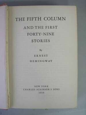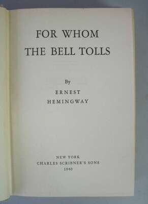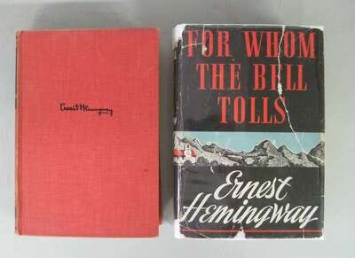 Hemingway, Ernest: For Whom the Bell Tolls. N.Y: Charles Scribner's Sons, 1940. 1st ed. 8vo, orig. cloth; spine toned. D/j ( with tear and separation to upper right corner, affecting title, small edge tears and creasing, loss to lettering on spine.) Early state panel of d/j. Hanneman A18a. * The Fifth Column and the First Forty-Nine Stories. N.Y: Charles Scribner's Sons, 1938. 8vo, orig. red cloth; scuffed, spine discolored. Slightly shaken. Pages lightly discolored. Small edge tear to front free endpaper. Hanneman A16a.