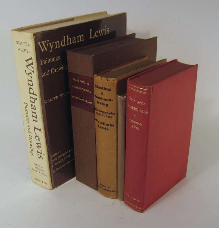 Wyndam Lewis: Lewis, Wyndam. Time and Western Man. L: Chatto and Windus, 1927. 1st ed. 8vo, orig. red cloth, gilt-lettered spine, top edge stained red, other edges rough trimmed; light edge wear. Morrow & Lafourcade A8a - variant 1. * The Old Gang and the New Gang. L: Desmond Harmsworth, 1933. 1st ed. Sm. 8vo, orig. grey & black paper cloth; light wear, edges untrimmed, d/j (spine & panel edges darkening.) M. & L. 20. * Blasting and Bombarding. L: Eyre & Spottiswoode, 1937. 1st ed. Lg. 8vo, orig. orange cloth; light wear, edges starting to darken, d/j (starting to darken, panel joints & edges scuffed, spine ends starting to chip. In custom cloth brown cloth fall-down box. M. & L. A26. * Paintings and Drawings. Berkeley: Univ. of Calif. Press, 1971. 4to, orig. beige cloth; minor wear, d/j (some edge wear.) Color & b/w plates. Includes catalogue raisonne.