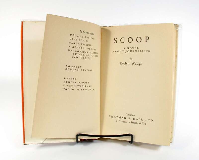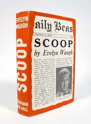 Waugh, Evelyn. Scoop. London: Chapman & Hall, 1938. 1st ed., 1st issue. 8vo, orig. bds; light wear, 1st issue d/j (minor edge wear, moderate foxing to verso of spine panel, some light foxing to verso of panel edges of very tops of flaps.) Endpapers slightly toned. With 2 sets of The Book Society wrap-around band inserted. With "As" last worn on p88 & d/j with "[D]aily Beas[t] masthead.