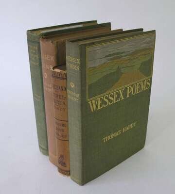 Hardy, Thomas: The Hand of Ethelberta. N.Y: Henry Holt, 1876. 1st Amer. ed. 12mo, orig. black stamped beige cloth; slightly dusty, spine starting to darken, light edge wear, very slightly cocked. Pencil signature of orig. owner dated "July 26, 1876' at head of title. Purdy, p23. * Wessex Poems. (London & New York: Harper), (1898). 1st ed. 8vo, orig. white buchram, gilt, a.e.g; scuffed, slightly dusty. Illus by Hardy. In special presentation or gift bdg. Purdy 96ff. * The N.Y. & London, 1899 ed. of the preceding, 8vo, orig. gilt-stamped, color pictorial green cloth, t.e.g., other edges untrimmed. Illus. by Hardy. Light wear. Purdy, p106. * Poems of the Past & Present. (N.Y. & London), (Harper), 1902. 8vo, orig. green cloth, gilt, t.e.g., other edges untrimmed. 8vo, light to moderate wear, a little dusty. Purdy 107ff - in variant, not recorded by P. Title & author in gilt letters in white cloth. Panel within green floral panel.