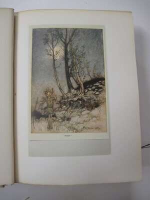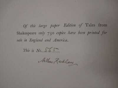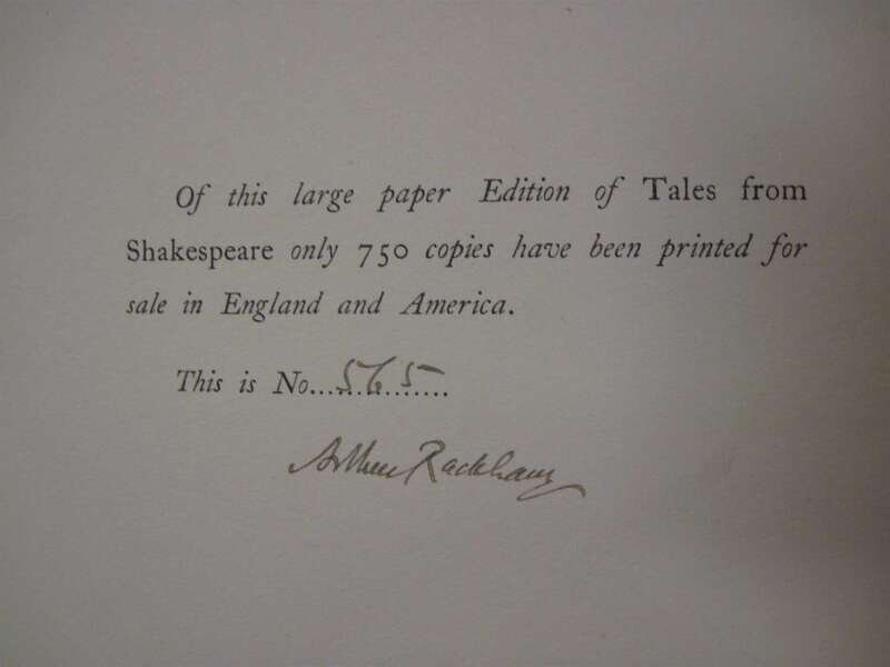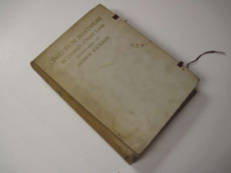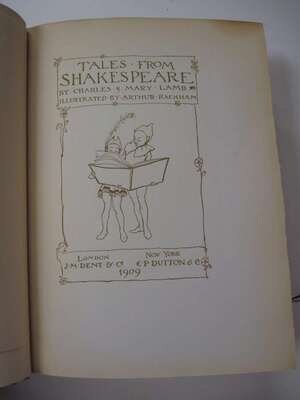 Rackham, Arthur, illus.; Lamb, Charles & Mary. Tales from Shakespeare. London: J.M. Dent & Co., 1909. #565/750, signed by Rackham. 4tp; orig. gilt-lettered cloth, ribbon ties (ties defective); staining and toning to front panel and spine. With 13 tipped-in color illus.