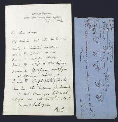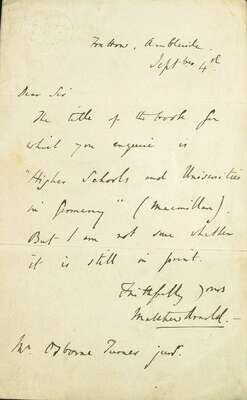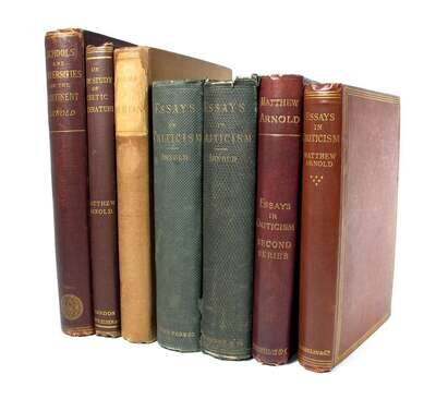 Arnold, Matthew: Essays in Criticism. L: Macmillan, 1865. 1st ed., 1st issue. Sm. 8vo, orig. terra-cotta cloth, gilt; light to moderate wear. Hinges slightly tender. With 2pp adverts. Untrimmed. * The 1st Amer. ed. of the preceding, Boston, 1865. 8vo, orig. cloth; light wear. * Another copy of the 1st Amer. ed., orig. cloth, moderate wear, hinges stressed. * Essays in Criticism. Second Series. L: Macmillan, 1888. 1st ed. 8vo, orig. deep purple cloth, gilt-lettered spine; light to moderate wear. * On the Study of Celtic Literature. L: Smith, Elder, 1865. 1st ed. 8vo, orig. burgundy cloth, gilt; light edge wear. 2pp adverts. Untrimmed. * Schools and Universities on the Continent. L: Macmillan, 1868. 1st ed. Tall 8vo, orig. purple cloth, gilt-lettered spine; edges & joints worn & starting to fray. Complete with 1/2 title. Untrimmed. Presentation copy from the "author." With 2 Matthew Arnold ALS inserted - Feb. 21, 1868, 1p, 8vo, on Education Dept. letterhead, signed M.A.T., Sept 4 n.d., 1p, 8vo, signed in full. * Poetry of Byron. L: Macmillan, 1881. 1st ed., 1/750 lg paper copies. 8vo, orig. cloth, paper spine label; slightly dusty, label chipped. Edited by M.A. Untrimmed.