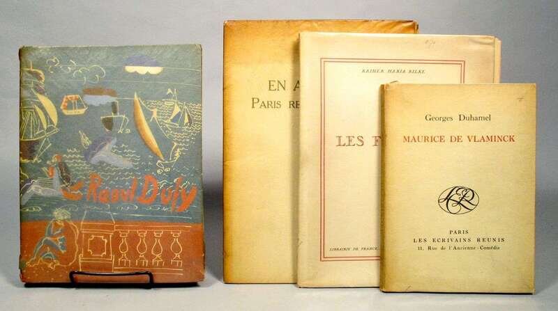 French Illustrated Imprints - 20th C: Eluard, Paul. En Avril 1944: Paris Respirait Encore! Paris: La Galerie Charpentier, [1945]. #983/991. Folio, orig. wrappers; toned. Color illus. by Jean Hugo. * Rilke, Rainer Maria. Les Fenetres. Paris, 1927. #365/500. Folio, orig. wrappers. Illus. by Baladine. * Duhamel, Georges. Maurice de Vlaminck. Paris: Les Ecrivans Reunis, 1927. #615/875. 4to, orig. wrappers; discolored. With 28 plates & 4 etchings. * Berr de Turique, Marcelle. Raoul Dufy. Paris: Librairie Floury, 1930. 4to, orig. pictorial wrappers. With engraved frontis.